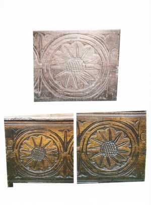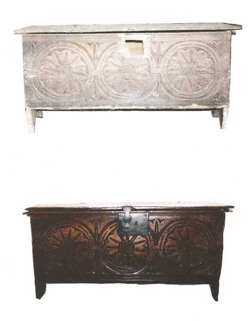 The coffer was obviously locally made. The flower decoration is a fairly typical West Country design, used in primitive scratch carvings on 15th century stone fonts in Devon and Cornwall, as well as in sophisticated decoration on some pieces of 17th century oak furniture. However, our coffer has cross hatching or nail head decoration in the centre of the flower, which does not appear on much Somerset furniture, although, it does appear on some pieces found in Dorset.