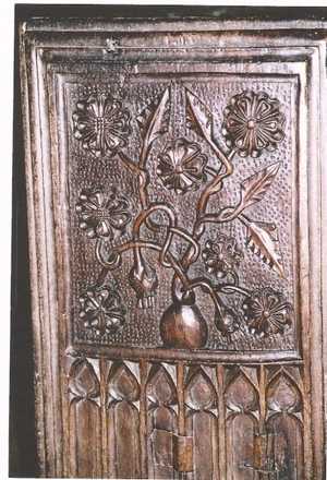 A lucky break came when visiting the parish church of St. Mary the Virgin at East Quantoxhead, a small village, north of the Quantock hills, on the Bristol Channel coast. Here we found an early 16th century bench end, decorated with a foliage and flower carving. The flowers have the same cross hatching decoration as the coffer. These bench ends are original to the church, and would have been installed between 1520 and 1530. There is a definite association between the carved decoration on the coffer, and this bench end.